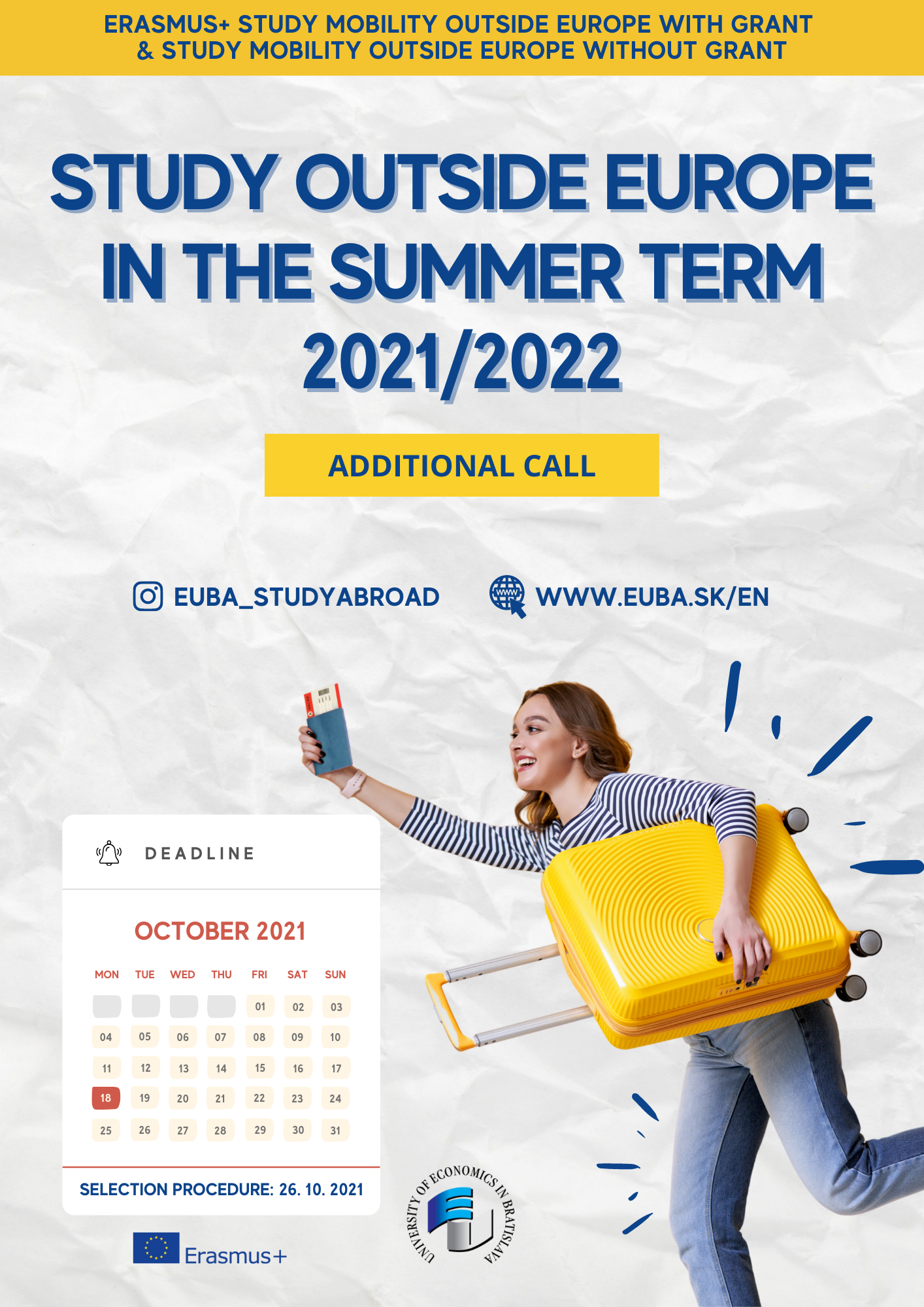 The Department of International Mobility at the EU in Bratislava announces an additional call for the academic year 2021/2022 for Study mobility within Erasmus+ Programme outside Europe with grant and Study Mobility at the Partner Universities without grant