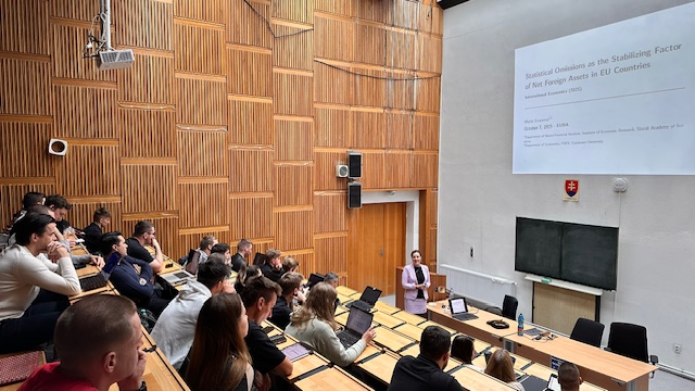 7. 10. 2025 prijala pozvanie na prednášku z predmetu Medzinárodné financie bývalá kolegyňa a súčasne absolventka nášho študijného programu Ing. Mária Širaňová, MA., PhD. Pani doktorka v súčasnosti pôsobí ako samostatná výskumná pracovníčka na Ekonomickom ústave Slovenskej akadémie vied a na funkčnom mieste docentky na Univerzite Komenského v Bratislave.