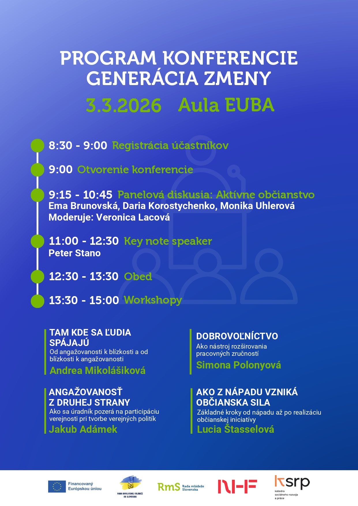 Rada mládeže Slovenska v spolupráci s Katedrou sociálneho rozvoja a práce Vás pozývajú na konferenciu Generácia zmeny, ktorá sa uskutoční dňa 3. marca 2026 v Aule Ekonomickej univerzity v Bratislave v čase od 9.00 h do 12.30 h.
