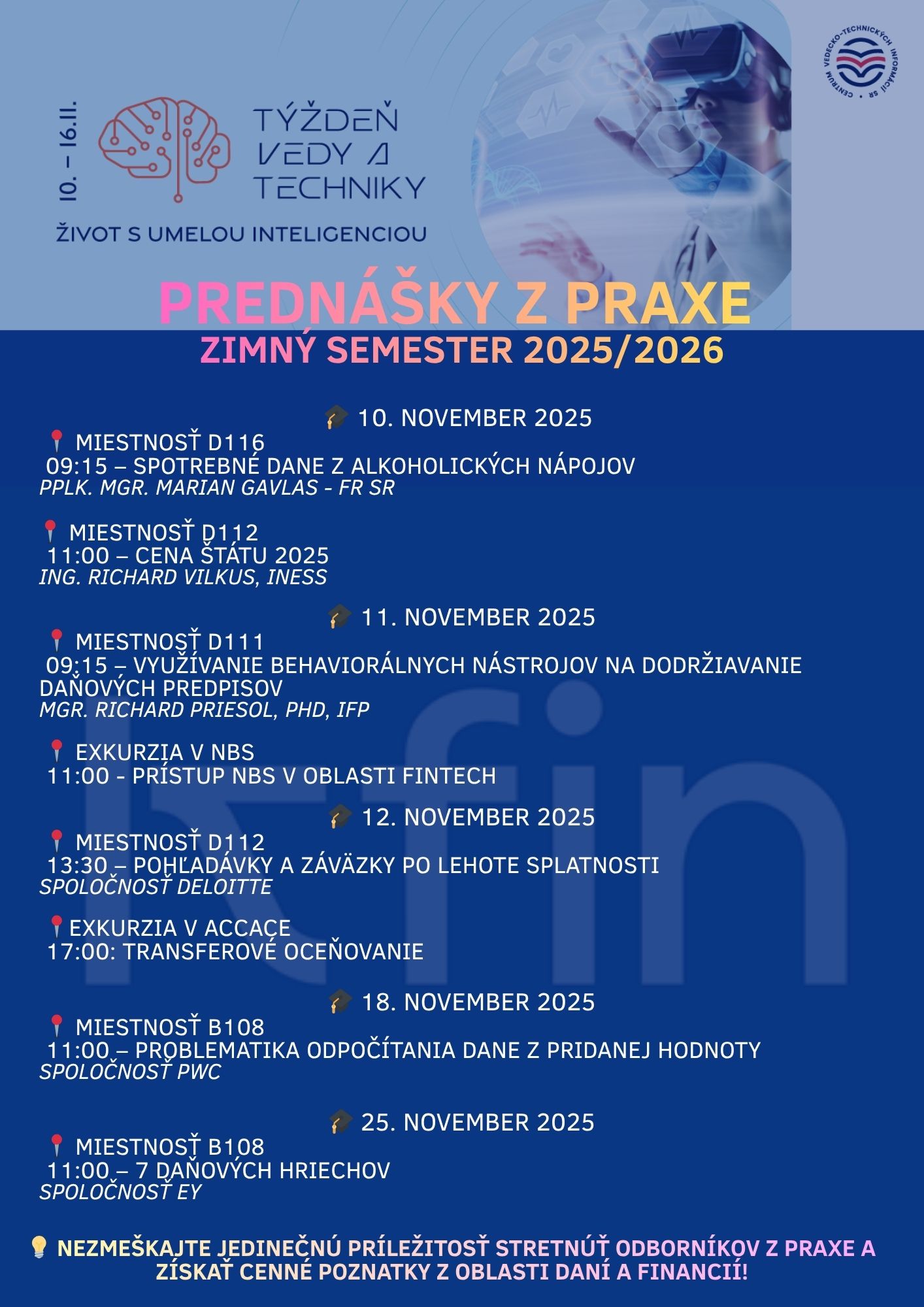V rámci celoslovenského podujatia Týždeň vedy a techniky 2025 pripravila Katedra financií sériu odborných prednášok z praxe, ktoré prinášajú študentom autentický pohľad na aktuálne otázky z oblasti daní, financií a podnikovej praxe.